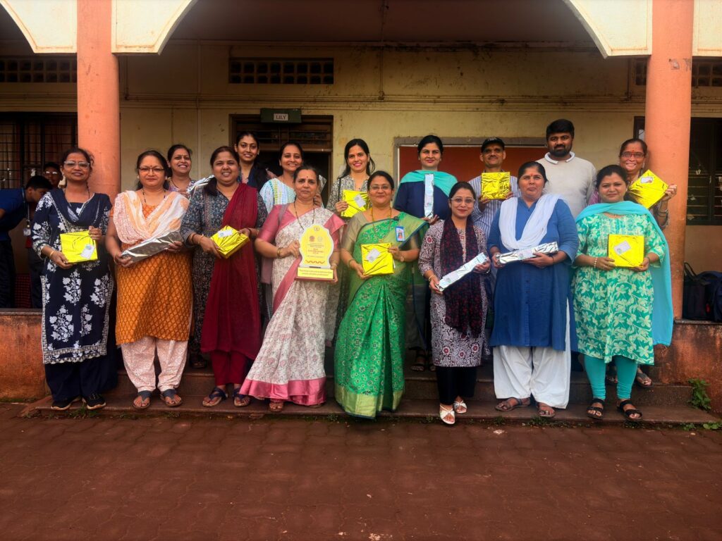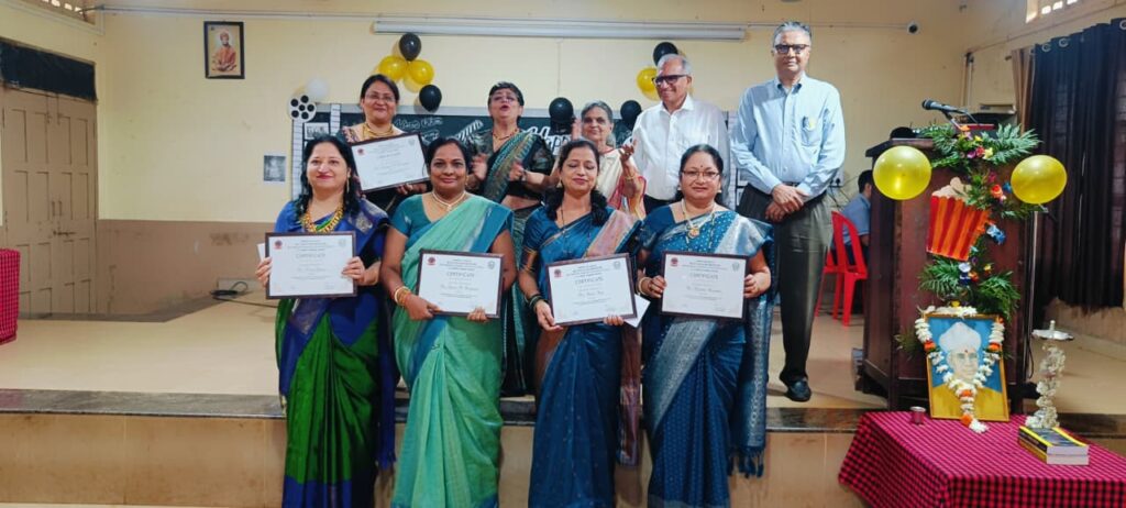 Mrs. Lakshmi N. Deshpande (Principal), Mrs. Prajkta Hongekar, Mrs. Lakshmi Deshpande, Mrs. Madhuri Rege, and Mrs. Veena Ganagi were felicitated for completing 20 years of dedicated service, while Mrs. Kumari Haldal was honored for maintaining full attendance. Their commitment and contribution to the institution were deeply appreciated.